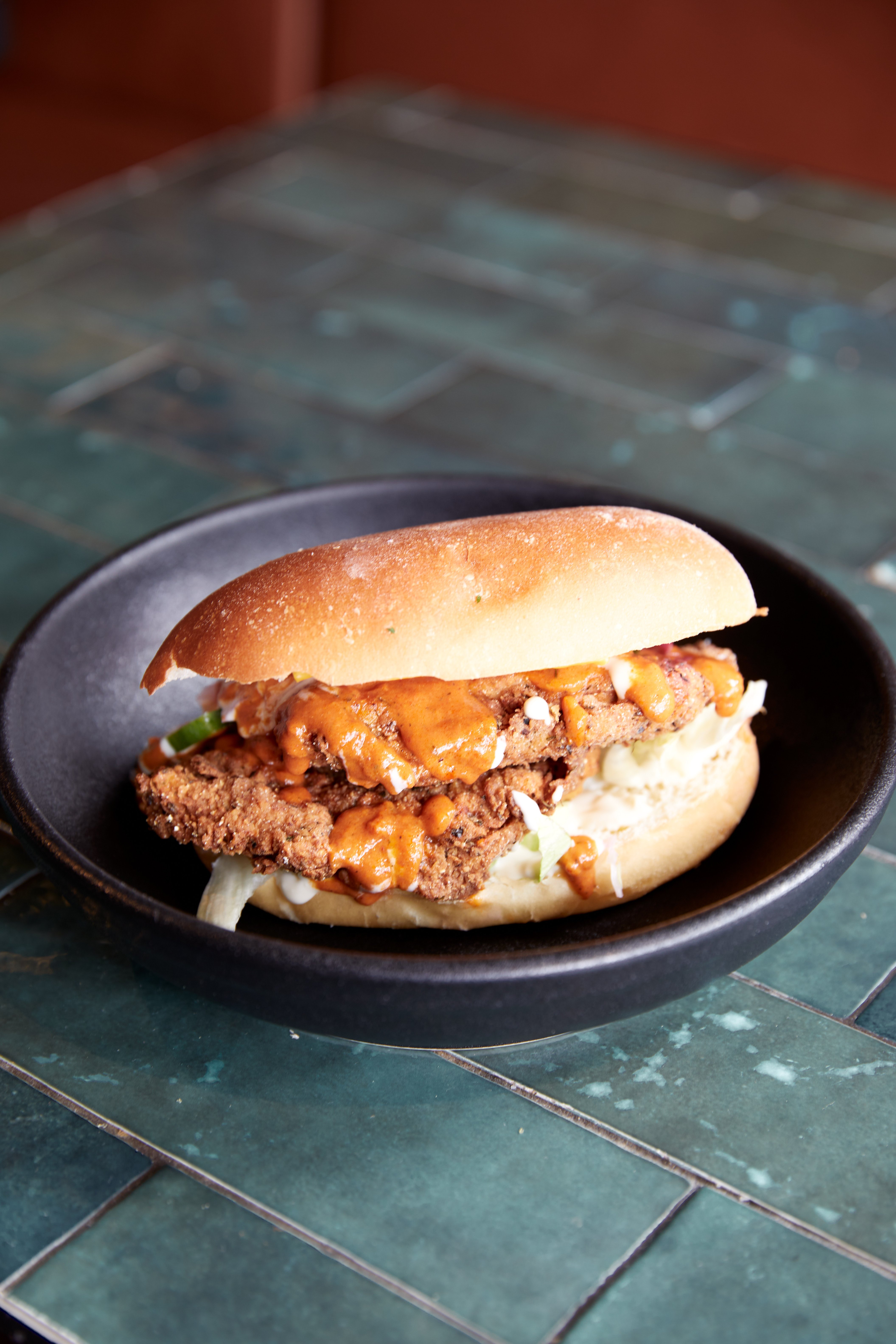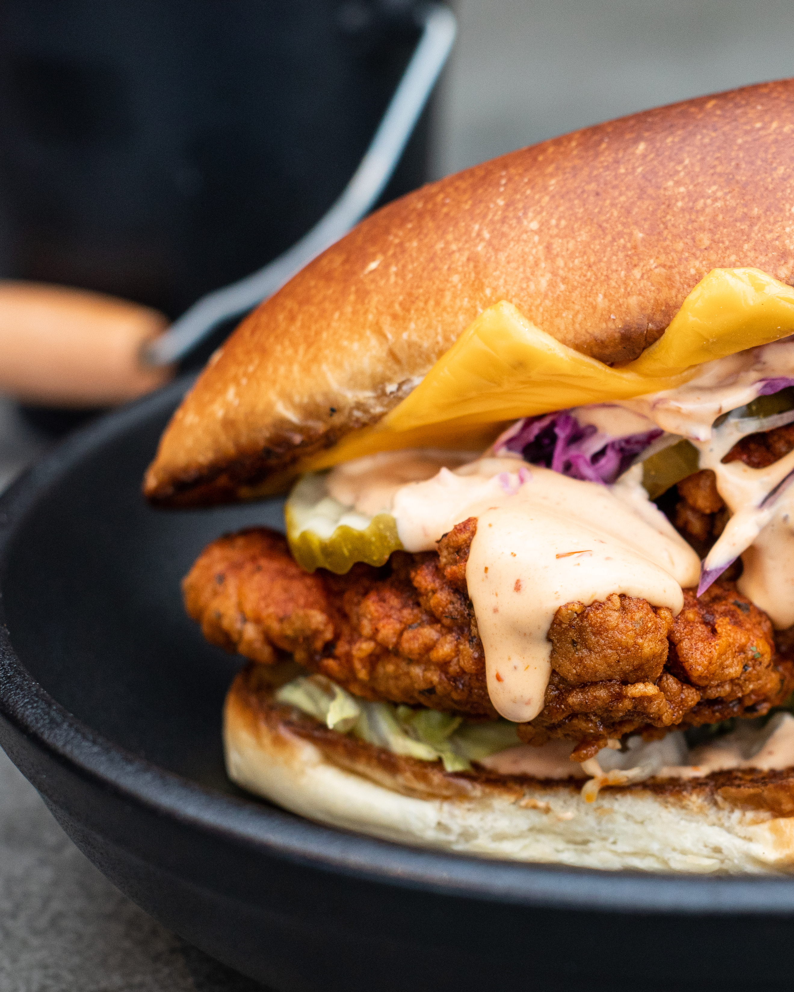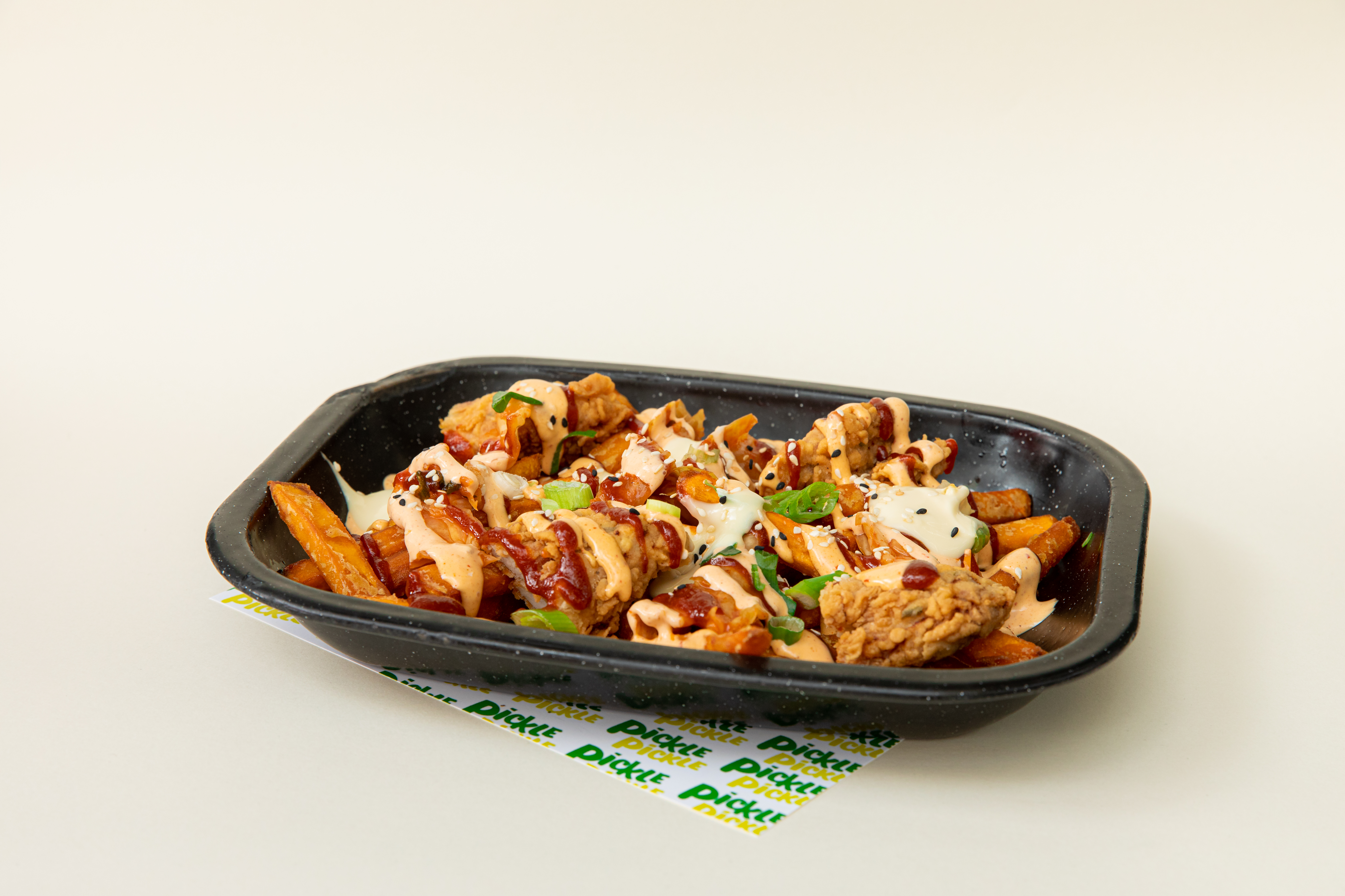 w/ fried chicken, sweet potato fries, cheddar cheese, gochujang sauce & chipotle mayo