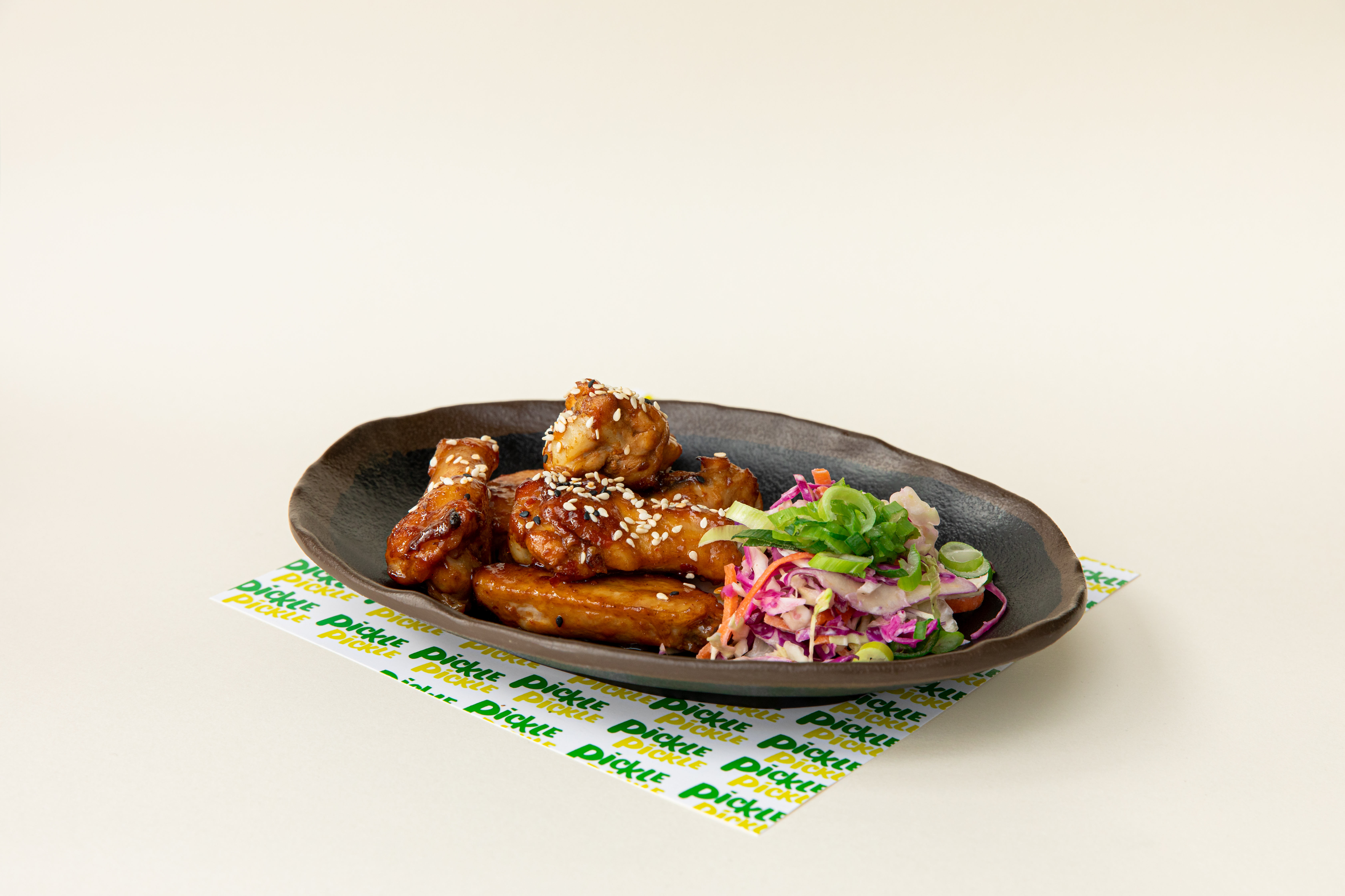 12 pieces, pickles, shoestring fries, slaw w/ garlic mayo